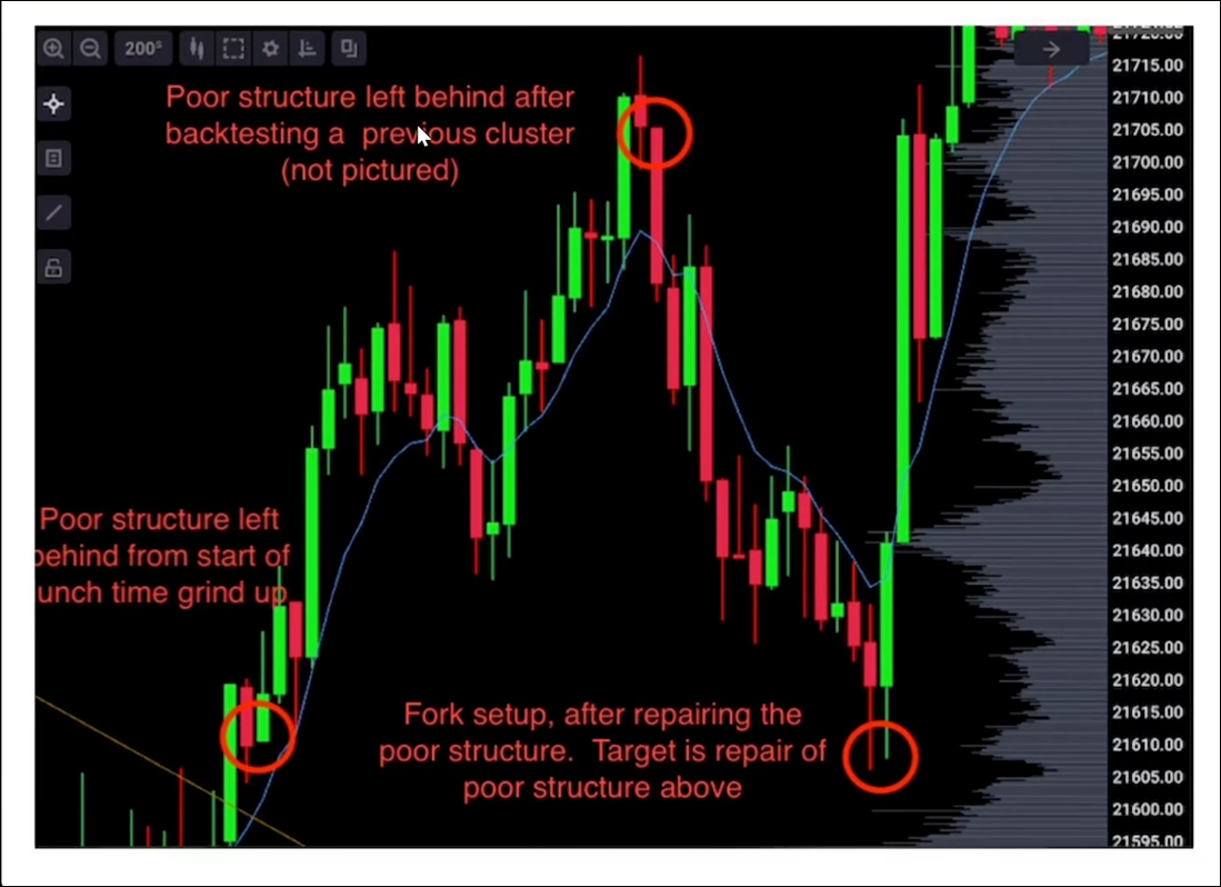 The Repair is often used as a target rather than the direct entry itself. For example, a Fork may form below an untouched Repair, making that Repair a natural upside objective. On the short side, an H pattern may roll over toward a lower Repair, which then becomes a logical downside target.