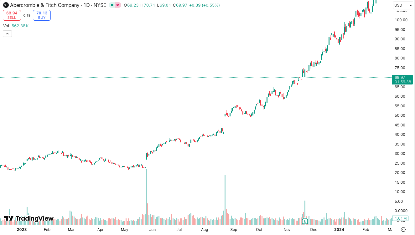 - Over the full multi-month trend, ANF climbed roughly 700–800%, moving from the low $20s to around $200