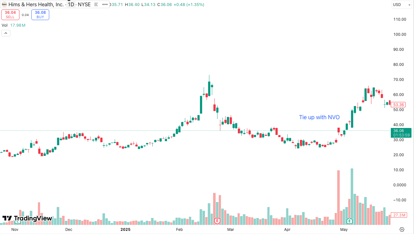 A new catalyst appeared when: HIMS announced an official partnership with Novo Nordisk, the pharmaceutical company that makes Wegovy and Ozempic.