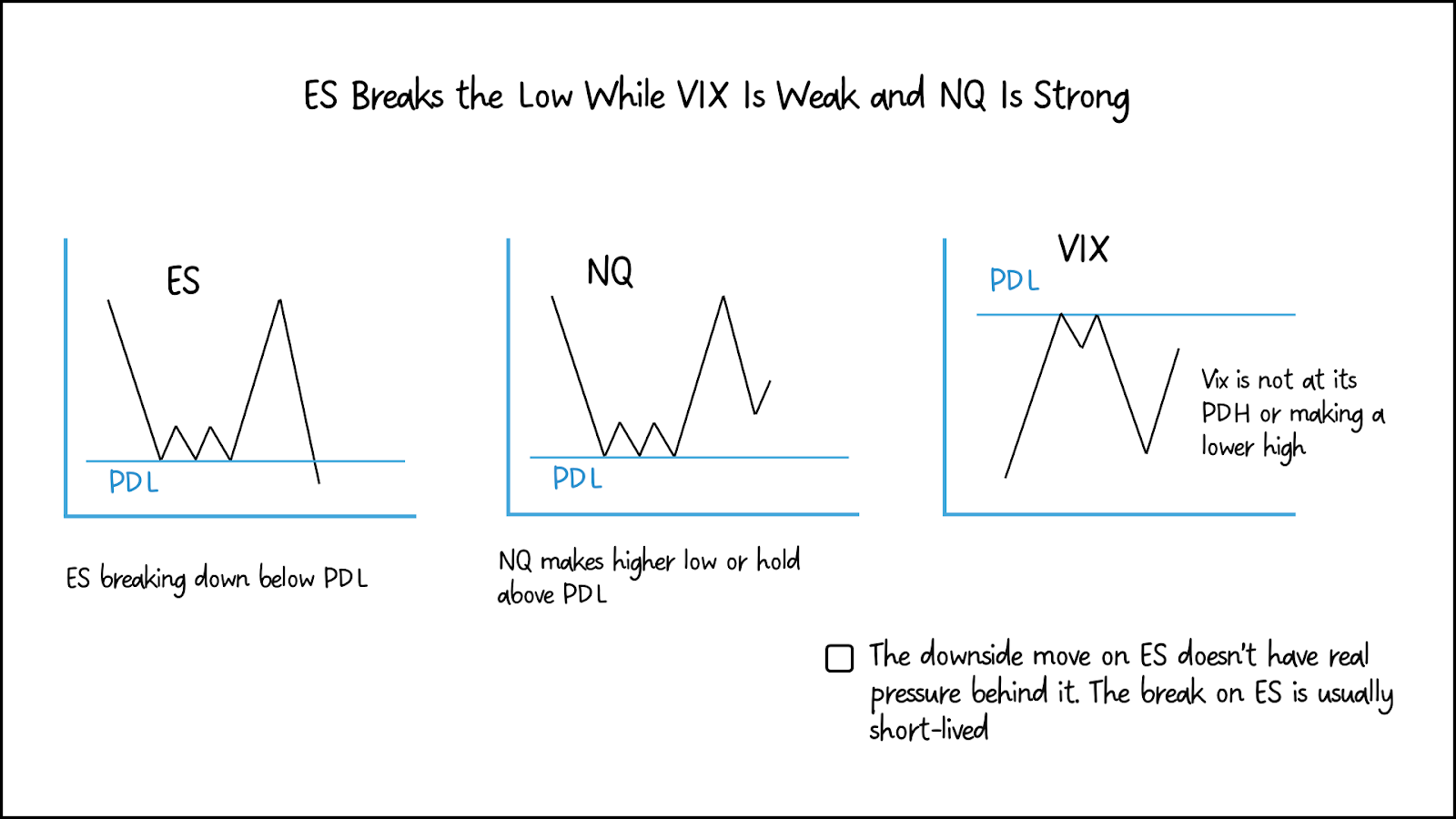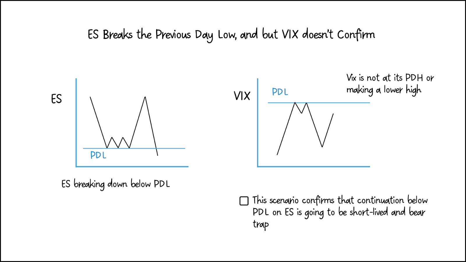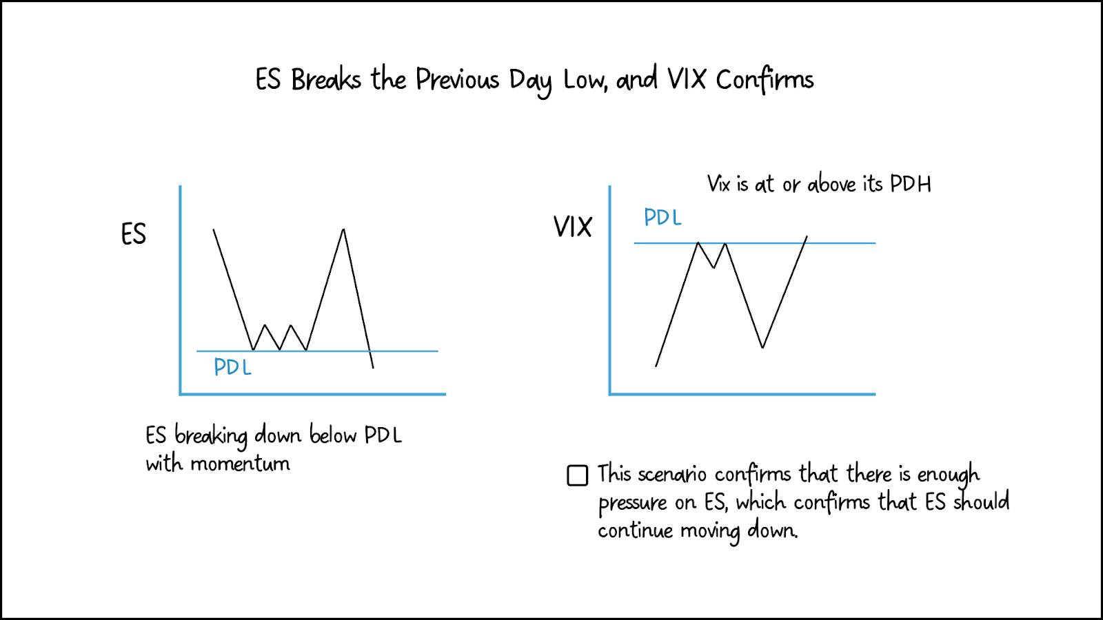When ES breaks below the previous day’s low, the move is only meaningful if the VIX supports it.